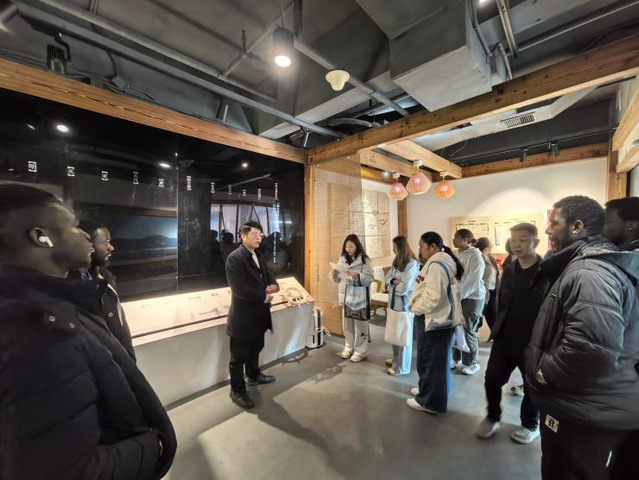 走进金山区博物馆,读懂城市与海洋的共生。 下午,实践团前往金山区博物馆参观,通过图文展陈、历史文物与现代城市发展的专题呈现,中外学生对金山沿海地区的历史沿革、生态变迁和海洋产业发展有了更系统的认识。从海渔文化到城市建设,从滨海生态到区域产业,这里所展现的历史演进,使同学们进一步理解上海如何在海洋文化中孕育、在时代变迁中发展。