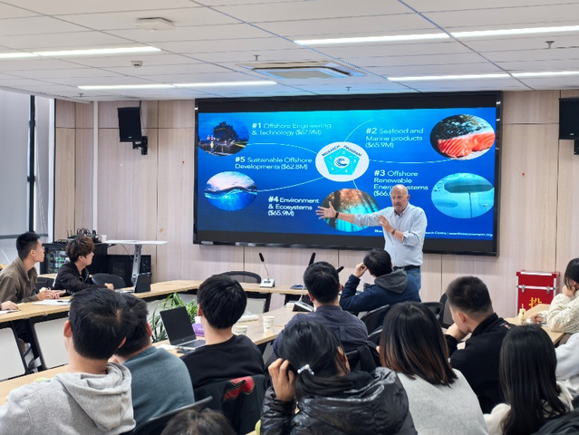 在学术交流中,林塞·怀特教授重点介绍了新西兰在海藻资源开发与蓝色经济领域的研究思路。他从全球海藻资源利用现状出发,指出目前全球约有264种海藻被人类利用、年产量约3500万吨,但产业结构仍以初级利用为主,还有充分的潜力有待开发。围绕该主题,林塞·怀特教授进一步介绍了新西兰蓝色经济合作研究中心近海海藻养殖及资源综合利用等方面的研究进展,强调海藻在医药、健康、营养和生物材料等高附加值产品开发中的重要作用。此外,他还重点介绍了奥克兰理工大学的相关信息,介绍了该校先进的科研与教学设施,以及新西兰在海洋生物技术领域的研究优势。