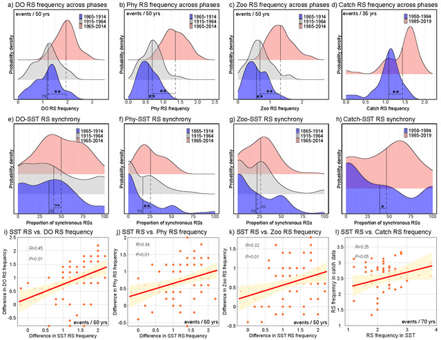 大海洋生态系统仅占全球海洋面积的22%,却拥有极高的生物多样性,支撑着全球80%的海洋渔业捕捞量,是人类海洋经济和生态安全的重要基石。海表面温度跃变是指海洋温度在暖相和冷相间发生的、持续十年至数十年的突发性跃变。这种变化会引起难以预料的海洋生态系统变动,此前已被证实与浮游生物群落更替、渔业资源崩溃等生态事件密切相关,如秘鲁鳀鱼渔业崩溃、大西洋西部海龟生长率骤降等。然而,在全球变暖背景下,人类活动如何影响该跃变的演化趋势及其深层生态风险尚未被系统揭示。