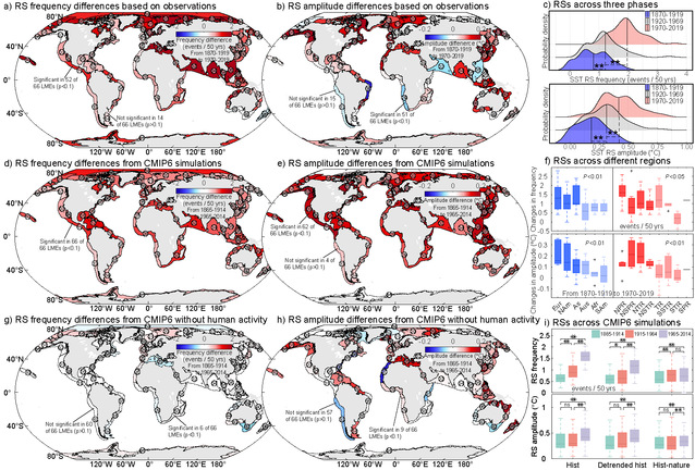 研究团队整合多套海温观测数据集、气候模式模拟数据,以及溶解氧、浮游生物和全球渔业捕捞数据,对全球66个大海洋生态系统展开了全面分析(图1)。结果显示,过去150年间,全球大海洋生态系统海表面温度跃变的频率和幅度飙升130%至140%(图2)。该趋势呈现明显的空间异质性,西边界流和东边界上升流系统成为热点区域,北半球跃变发生显著强于南半球。通过对比不同气候模式模拟结果,团队发现自然强迫下海洋温度突变事件无显著变化,而人为变暖能抑制冷相温度转变、强化暖相转变,让海洋温度呈“阶梯式”上升,证实了人类活动引发的全球变暖是驱动这一变化的关键因素。未来气候情景模拟显示,在符合《巴黎协定》1.5℃温控目标的低排放情景下,21世纪后半叶海洋温度突变的频率和幅度有望回落至20世纪后期水平,但高排放情景下突变频率将激增130%-180%,幅度上升20%-40%。值得警惕的是,北极海域即便在最严格的减排情景下,其温度突变事件仍会持续加剧,这可能与海冰的持续融合有关。