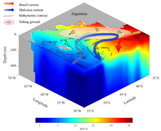 图1 西南大西洋巴塔哥尼亚海域海洋环境及阿根廷滑柔鱼渔场分布