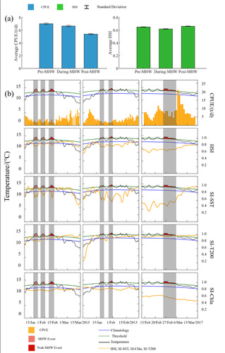 图3 MHW事件前后CPUE、HSI和SI的变化。(a)所有MHW事件前后CPUE和HSI的平均值;(b)2013年1-2月和2017年2-3月MHW事件期间, CPUE、温度、HSI和SI的时间序列。阴影区域表示MHW持续时间,深红色表示MHW峰值日。所有MHW事件均发生在59°-60°W,44°-46°S之间。