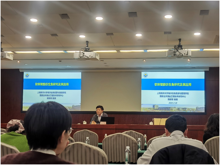 2月28日下午,国家远洋渔业工程技术研究中心主任、教育部重点实验室主任、中水现代化远洋渔业研究院院长陈新军教授,应邀在上海市农委的邀请,在系统干部通识教育讲座第十期中做《软体智能仿生鱼研究及其应用》的前沿技术讲座。讲座从国家需求、发展现状、创新成果、渔业应用以及未来发展趋势等方面进行了讲解,讲座报告取得预期的效果,为学校更好地服务上海市地方渔业经济发展提供了新路径。仿生鱼成果在水域生物资源监测、调查,以及科普、文化、水族馆等领域应用前景广阔。