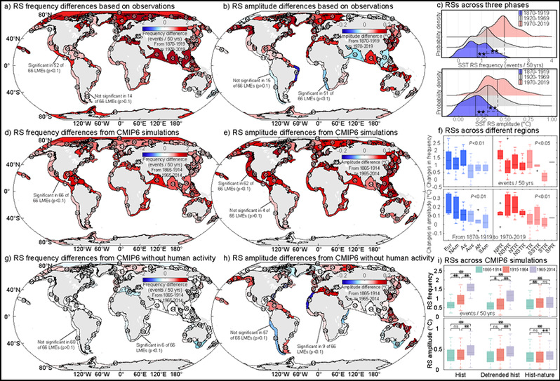 研究团队整合多套海温观测数据集、气候模式模拟数据,以及溶解氧、浮游生物和全球渔业捕捞数据,对全球66个大海洋生态系统展开了全面分析(图 1)。结果显示,过去150年间,全球大海洋生态系统海表面温度跃变的频率和幅度飙升130%至140%(图2)。该趋势呈现明显的空间异质性,西边界流和东边界上升流系统成为热点区域,北半球跃变发生显著强于南半球。通过对比不同气候模式模拟结果,团队发现自然强迫下海洋温度突变事件无显著变化,而人为变暖能抑制冷相温度转变、强化暖相转变,让海洋温度呈“阶梯式”上升,证实了人类活动引发的全球变暖是驱动这一变化的关键因素。未来气候情景模拟显示,在符合《巴黎协定》1.5℃温控目标的低排放情景下,21世纪后半叶海洋温度突变的频率和幅度有望回落至20世纪后期水平,但高排放情景下突变频率将激增130%-180%,幅度上升20%-40%。值得警惕的是,北极海域即便在最严格的减排情景下,其温度突变事件仍会持续加剧,这可能与海冰的持续融合有关。
