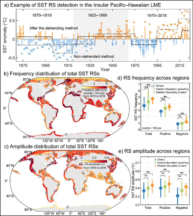 3月19日,我校陈新军团队邢勤旺博士后、高子惠博士与东京大学、山东大学等合作的研究论文“Human-induced intensification of sea surface temperature regime shifts threatens global Large Marine Ecosystems”发表在国际权威期刊《自然・通讯》(Nature Communications),该项工作系统解析了过去150年间全球大海洋生态系统十年尺度温度跃变的演化规律,证实人类活动引起的全球变暖是驱动海洋温度跃变加剧的关键因素,揭示了温度跃变引发的海洋生态与渔业连锁风险,为全球海洋生态保护和气候应对策略制定提供了关键科学依据。